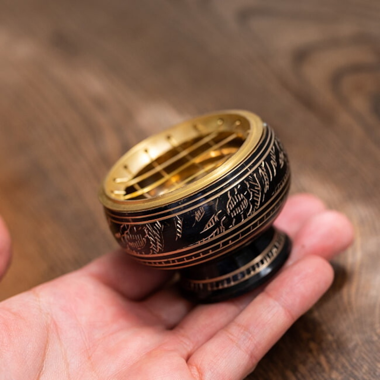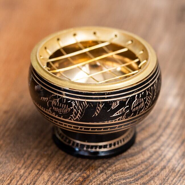 竹ひごを使ったスティック香と違い、焦げ臭さのないピュアな香りが楽しめるのが特徴です。陶器皿でも焚けますが、このブラス製の香炉を使えば、香りだけでなく雰囲気も格別。空間をぐっと神秘的に演出してくれます。